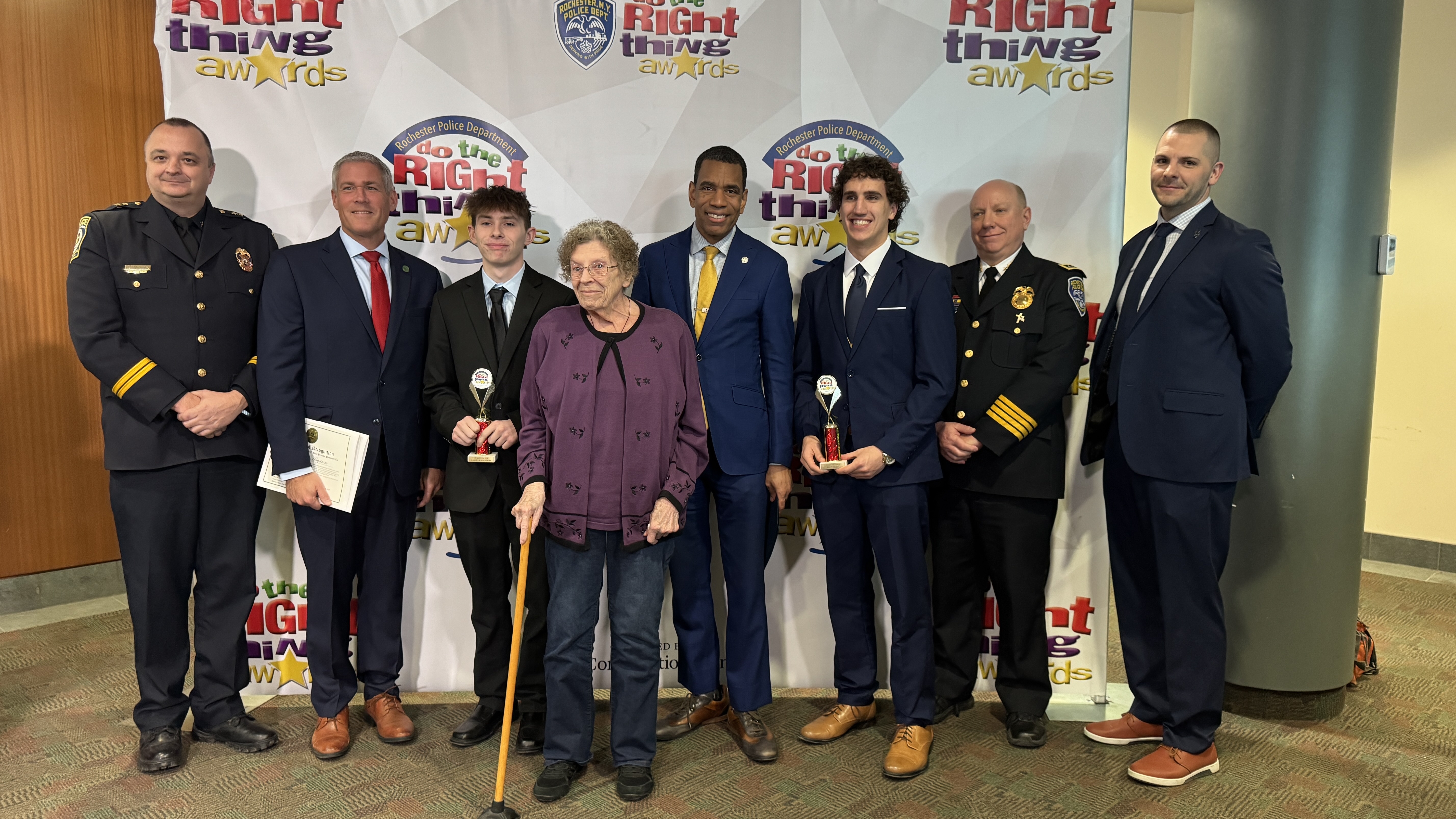 Two Gates Chili High School students have been recognized for their heroic efforts to help a neighbor. Seniors Brennan Day and Raymond Hagstrom were presented with Do the Right Thing Awards at a sp...